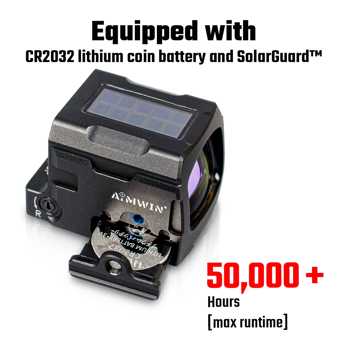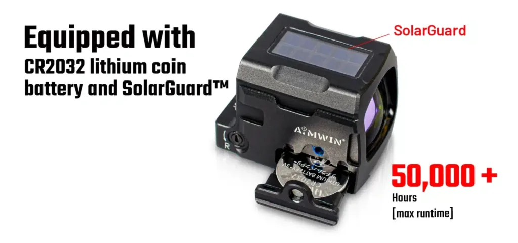 Systém je napájen baterií CR2032 se zálohováním solárním panelem a vydrží až 50 000 hodin při nízkém nastavení, čímž se snižuje vybíjení a udržuje optiku v provozu i v případě vybití baterie.