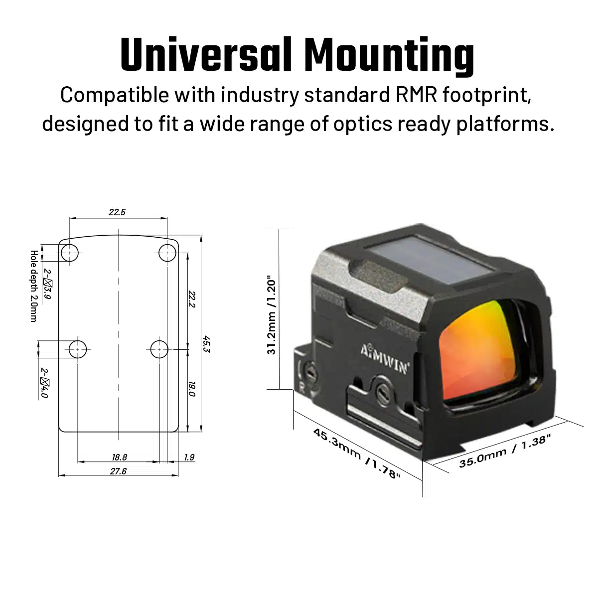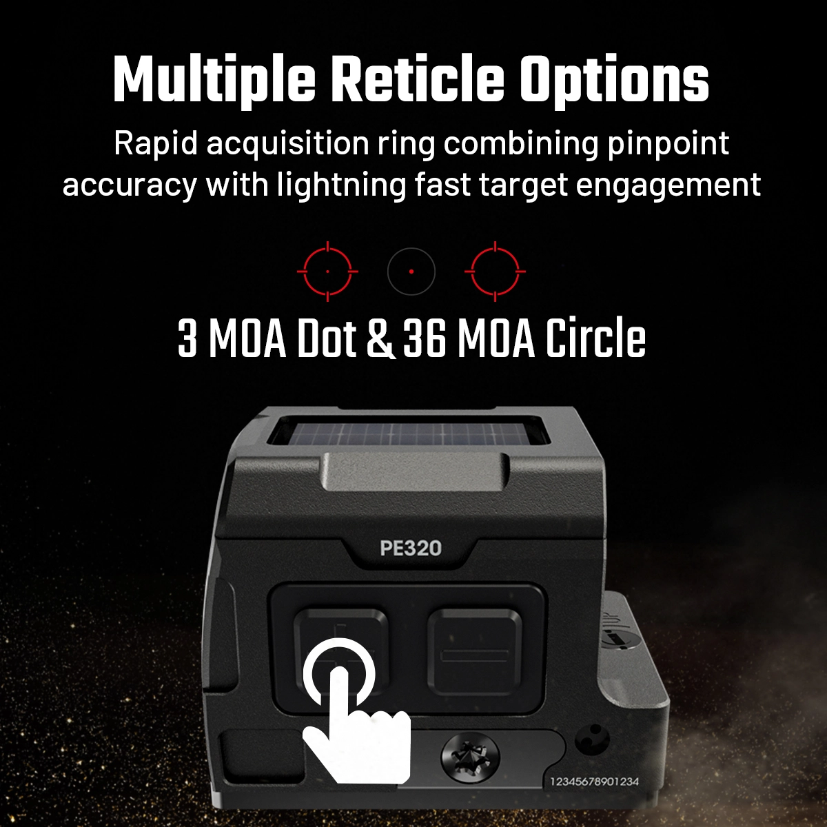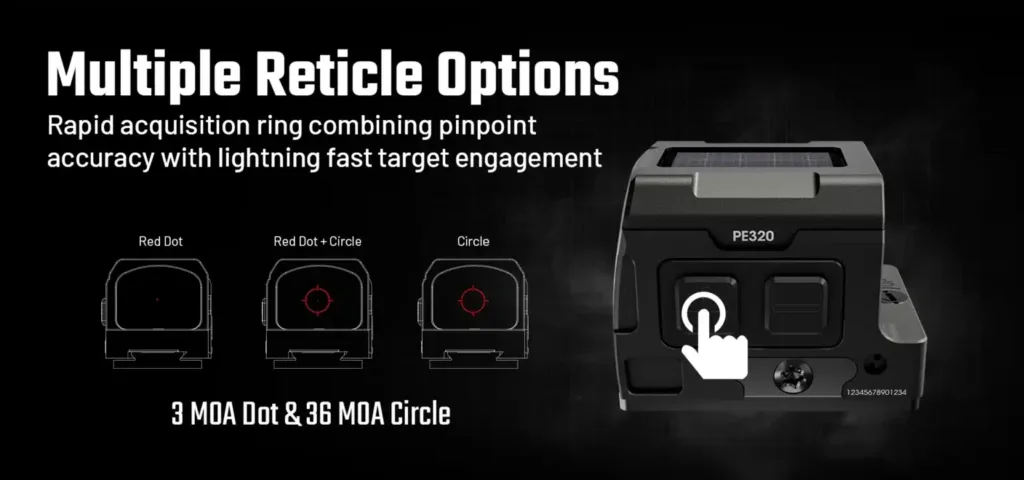Přepínejte mezi 3MOA tečkou a 36MOA kroužkem se třemi režimy osnovy pro precizní zaměření, rychlé zaměřování nebo intuitivní vizuální ovládání s nastavením 100 MOA (1 MOA na kliknutí) na nulu a přizpůsobením se jakékoli platformě.